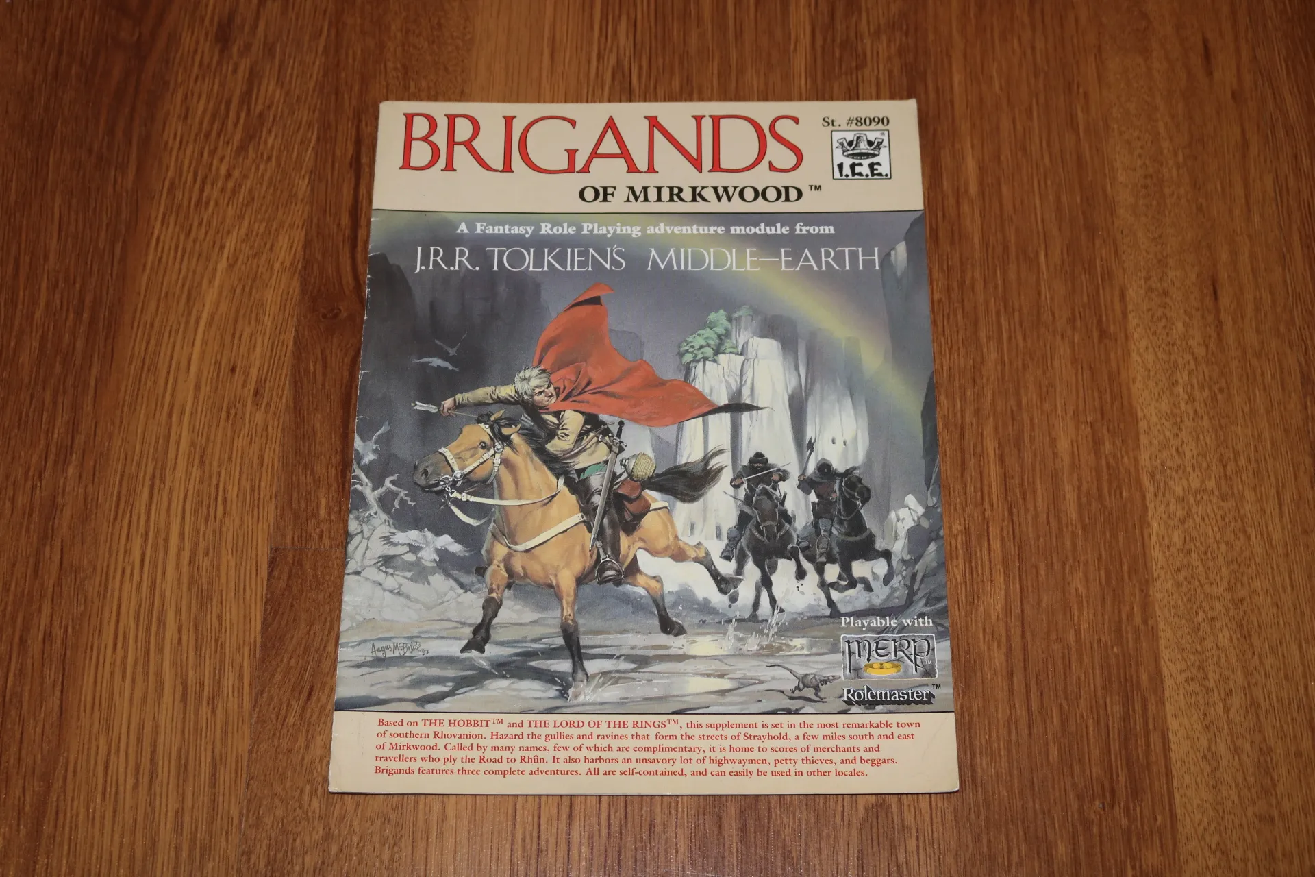 Description: This supplement is set in the most remarkable town of southern Rhovanion. Hazard the gullies and ravines that form the streets of Strayhold, a few miles south and east of Mirkwood. Called by many names, few of which are complimentary, it is home to scores of merchants and travellers who ply the Road to Rhûn. It also harbors an unsavory lot of highwaymen, petty thieves, and beggars. Brigands features three complete adventures. All are self-contained, and can easily be used in other locales.