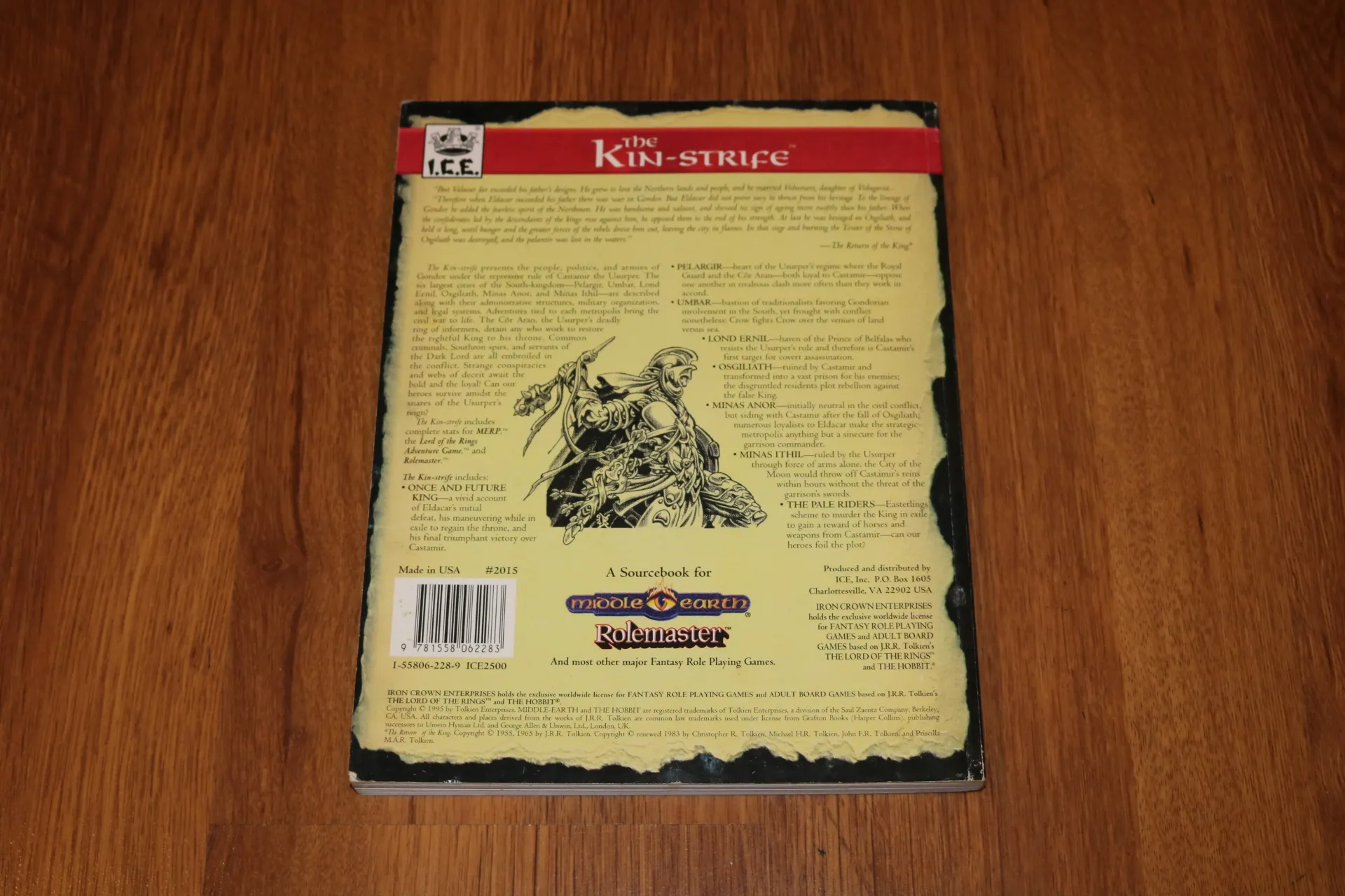 A description of the Kin-Strife era of Gondor (T.A. 1432-1437), including details of Gondor’s six major cities (Pelargir, Umbar, Dor-en-Ernil, Osgiliath, Minas Anor, Minas Ithil) and a few short adventures in each locale.