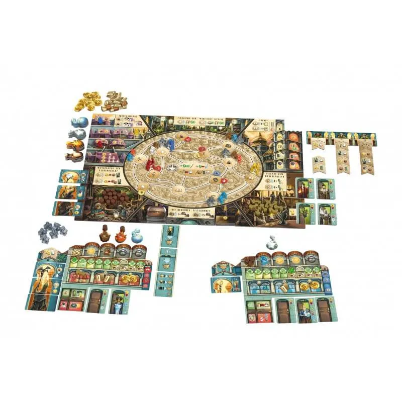 In Djinn, you take turns moving across a map that shows thirteen locations. These locations are linked to actions where you can get the resources you need and catch the Djinn that are in six locations. In those locations you can do things like receive bottles and corks, collect magical power, buy magical items, hire mages to accompany you, discover secret passages, and more.