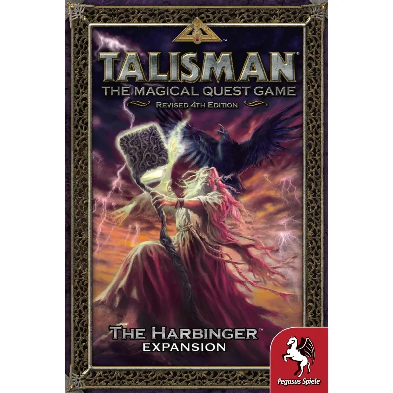 The Harbinger expansion offers Talisman Revised 4th Edition players 75 Harbinger Cards, 10 new Spell Cards, 10 Terrain Cards, 32 Omen Cards, 2 Alternative Ending Cards, 3 new character cards and plastic figures, and the Harbinger, a mysterious figure warning of the apocalypse to come. Can the heroes stop the end of the world?