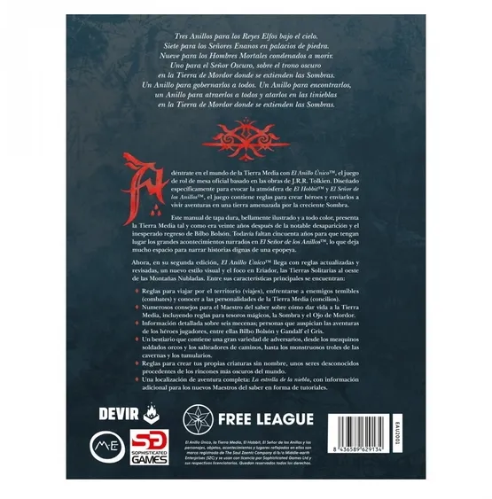 Tres Anillos para los Reyes Elfos bajo el cielo. Siete para los Señores Enanos en palacios de piedra. Nueve para los Hombres Mortales condenados a morir. Uno para el Señor Oscuro, sobre el trono oscuro en la Tierra de Mordor donde se extienden las Sombras. Un Anillo para gobernarlos a todos. Un Anillo para encontrarlos, un Anillo para atraerlos a todos y atarlos en las tinieblas en la Tierra de Mordor donde se extienden las Sombras. Adéntrate en el mundo de la Tierra Media con El Anillo Único™, el juego de rol de mesa oficial basado en las obras de J.R.R. Tolkien.