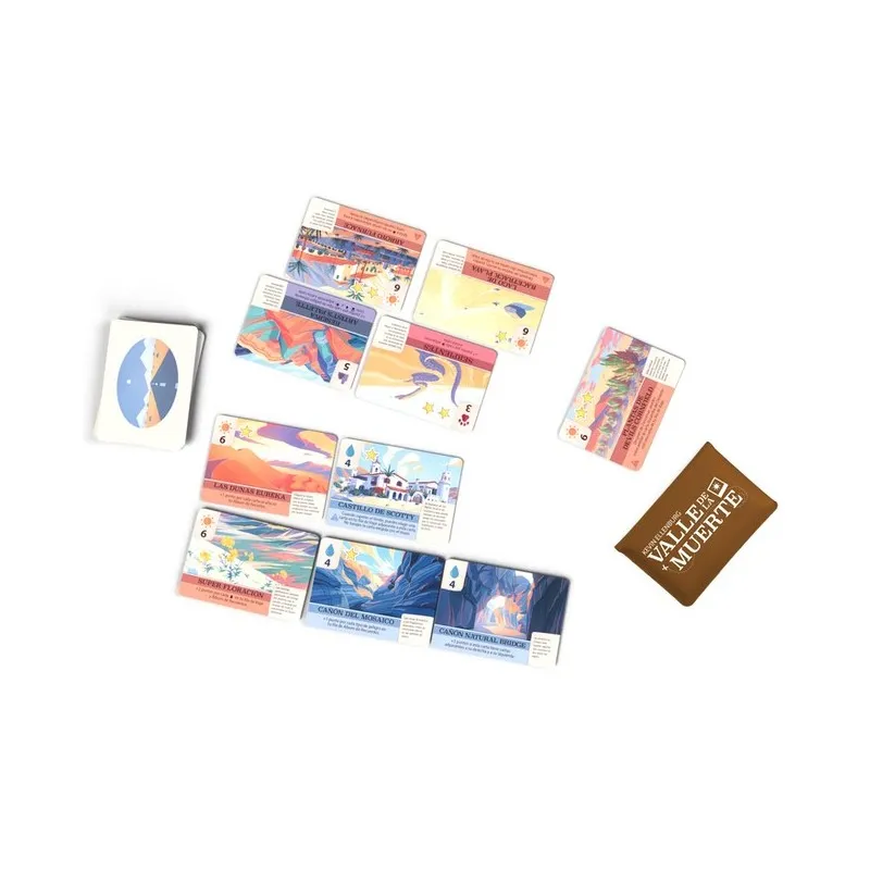 El Valle de la Muerte es un juego para 2 jugadores de Kevin Ellenburg donde los jugadores asumen el rol de unos aventureros que tienen que documentar un peligroso viaje por este maravilloso enclave. Con mecánicas de forzar la suerte y construcción de tablero, en cada turno deberás asignar una carta a tu viaje o a tu álbum de recortes teniendo en cuenta los efectos de cada carta y evitando morir en el intento.