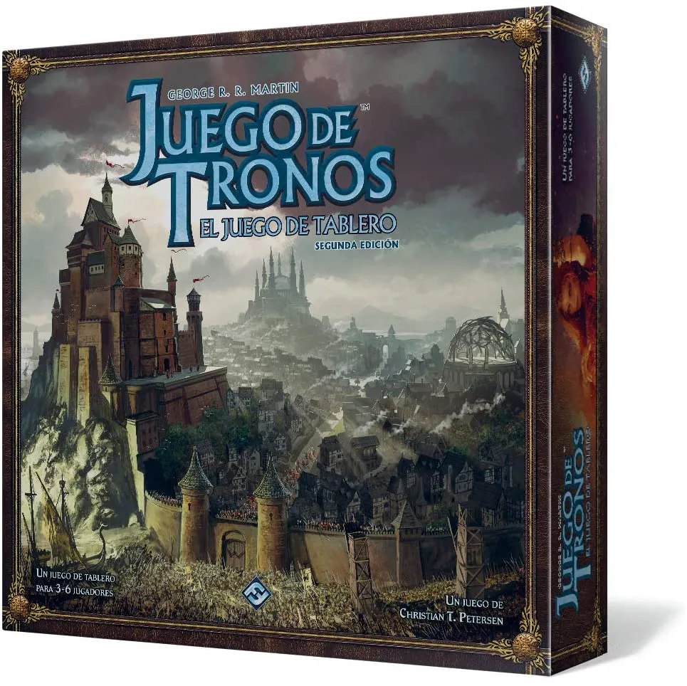 ¡Reclama el Trono de Hierro y las tierras de Poniente! El rey Robert Baratheon ha muerto y los reinos de Poniente se preparan para una guerra inminente. La Casa Lannister, a la que pertenece Cersei, la que fuera reina de Robert, reclama el trono para su joven hijo Joffrey. Desde su residencia en la isla de Rocadragón, Stannis, el hermano menor de Robert, exige para sí el trono, que le pertenece por legítimo derecho. En las Islas del Hierro, la Casa Greyjoy se prepara para embarcarse en una segunda rebelión, con una meta más ambiciosa aún esta vez. En el norte, la Casa Stark reúne a sus fuerzas para defender lo que cree justo. En el sur, la opulenta Casa Tyrell abriga desde hace tiempo la ambición de sentarse en el Trono de Hierro, pero debe mantenerse siempre cauta frente a la ancestral Casa Martell y su legado de venganza. Y mientras tanto, en el lejano norte más allá del Muro, la amenaza de los Salvajes va cobrando fuerza sin cesar. Se forman ejércitos y los cuervos vuelan; el choque de reyes es ya inevitable. En Juego de Tronos: El Juego de Tablero, basado en la popular serie de novelas Canción de Hielo y Fuego de George R.R. Martin, los jugadores toman el control de las grandes Casas de Poniente y se embarcan en una épica lucha para hacerse con el Trono de Hierro. Sumérgete en un juego que requiere planificación estratégica, una cuidadosa distribución del poder y la diplomacia más exquisita, todo ello ambientado en el emocionante mundo de Canción de Hielo y Fuego. Esta edición actualizada aporta numerosas mejoras, pues incorpora elementos de expansiones anteriores, incluyendo puertos, guarniciones, cartas de los Salvajes y torres de asedio. Además, presenta innovaciones como las útiles pantallas del jugador para ocultar tus meticulosos planes de miradas indiscretas, mientras que las cartas de Avatares de la guerra añaden riesgo a las batallas.