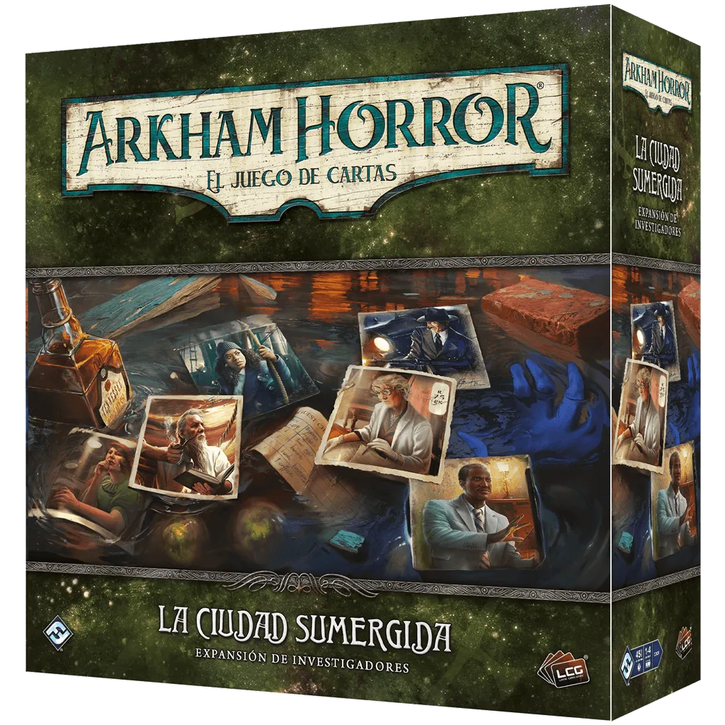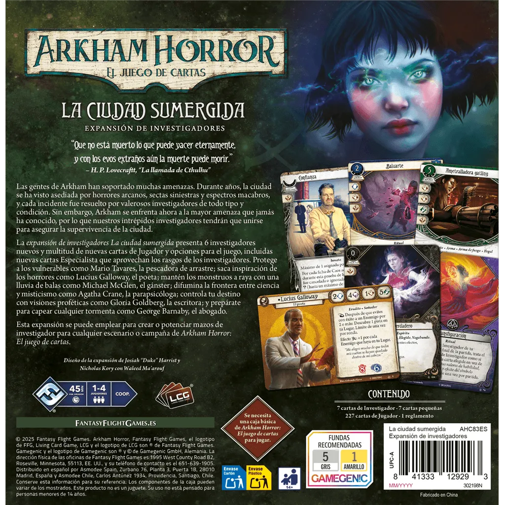 La expansión de investigadores La ciudad sumergida presenta 6 investigadores nuevos y multitud de nuevas cartas de Jugador y opciones para el juego, incluidas nuevas cartas Especialista que aprovechan los rasgos de los investigadores. Protege a los vulnerables como Mario Tavares, la pescadora de arrastre; saca inspiración de los horrores como Lucius Galloway, el poeta; mantén los monstruos a raya con una lluvia de balas como Michael McGlen, el gánster; difumina la frontera entre ciencia y misticismo como Agatha Crane, la parapsicóloga; controla tu destino con visiones proféticas como Gloria Goldberg, la escritora; y prepárate para capear cualquier tormenta como George Barnaby, el abogado.