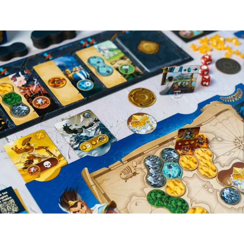 To prevail, you will need to erect majestic temples, forge orichalcum tokens or win the favors of titans (by creating areas of their favorite landscapes. The first to get to 5 victory points while clearing their Island of all Monsters wins the game.
