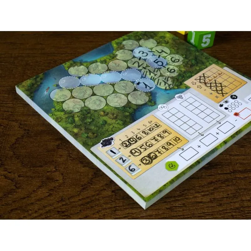 Trek 12 Amazonie is a roll-and-write exploration game, with evolutive gameplay and content. Every player plays simultaneously. To score points, you have to create trials (chains of consecutive numbers) and zones (areas of a same number) and to observe the fauna. The player who scores the most win.