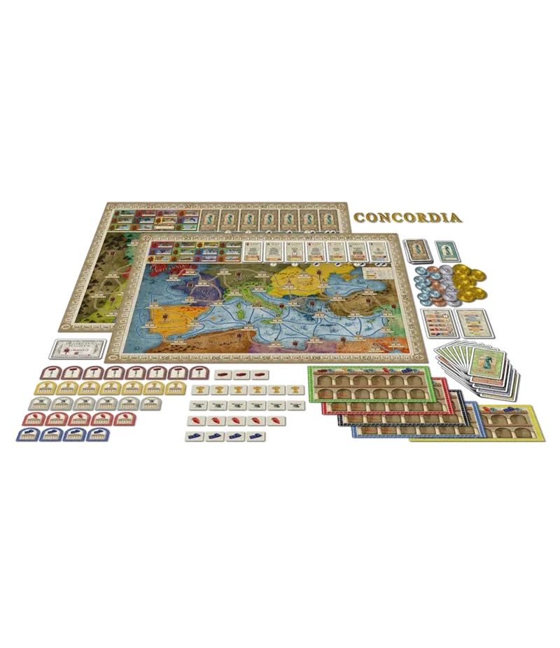 Concordia es un juego de desarrollo económico para 2 a 5 jugadores ambientado en la época romana. El juego no deja demasiado espacio a la suerte, por lo que los jugadores en lugar de confiar en una buena tirada de dados o en robar la carta adecuada, deberán apostar por su capacidad de planificación para desarrollar la estrategia idónea que les conduzca a la victoria. Sin olvidar claro está; observar e intuir los próximos movimientos de sus rivales para conseguir que no alcancen sus objetivos a la par que completan los suyos.