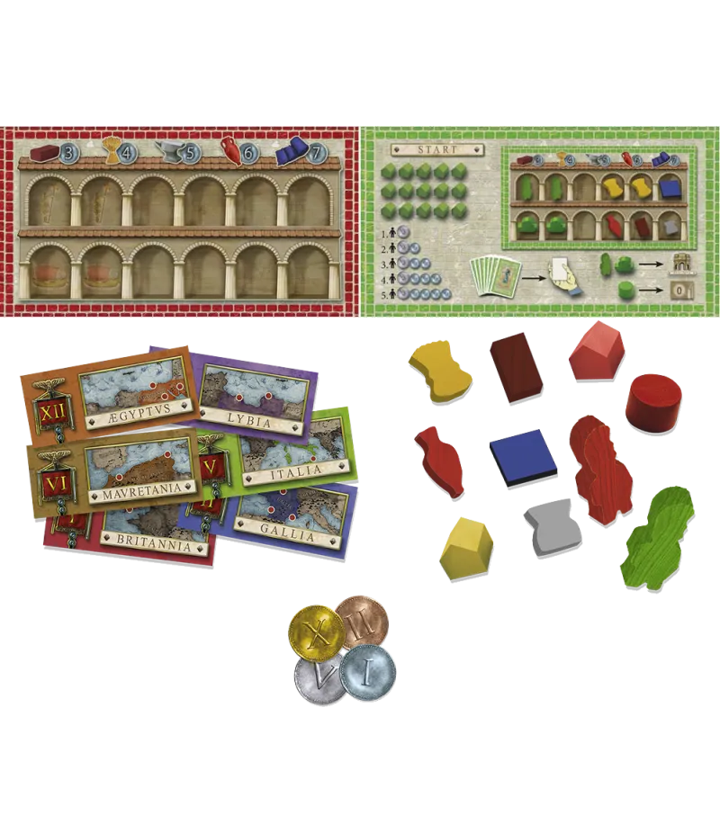 Two thousand years ago, the Roman Empire ruled the lands around the Mediterranean Sea. With peace at the borders, harmony inside the provinces, uniform law, and a common currency, the economy thrived and gave rise to mighty Roman dynasties as they expanded throughout the numerous cities. Guide one of these dynasties and send colonists to the remote realms of the Empire; develop your trade network; and appease the ancient gods for their favor — all to gain the chance to emerge victorious!