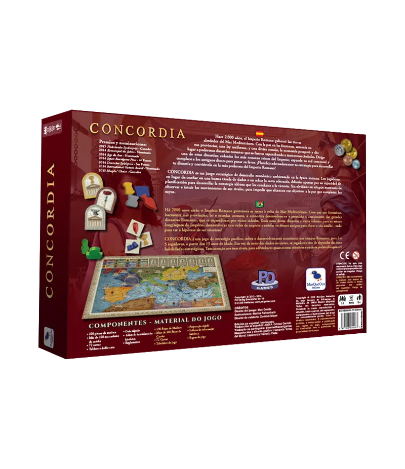 Concordia es un juego de mesa para 2-5 jugadores, 100 min duración, 13+ años edad. En español y portugués, nuevo a estrenar.