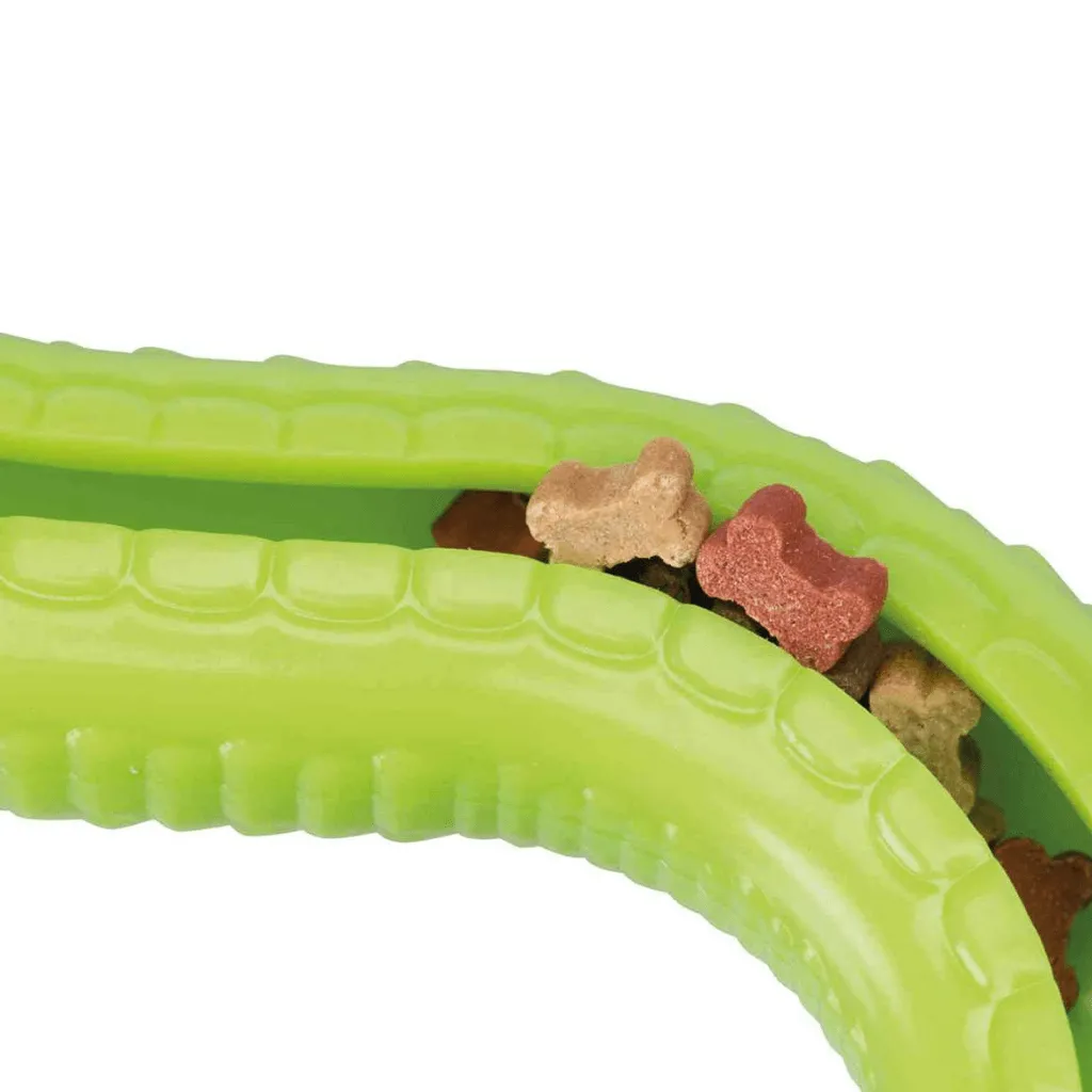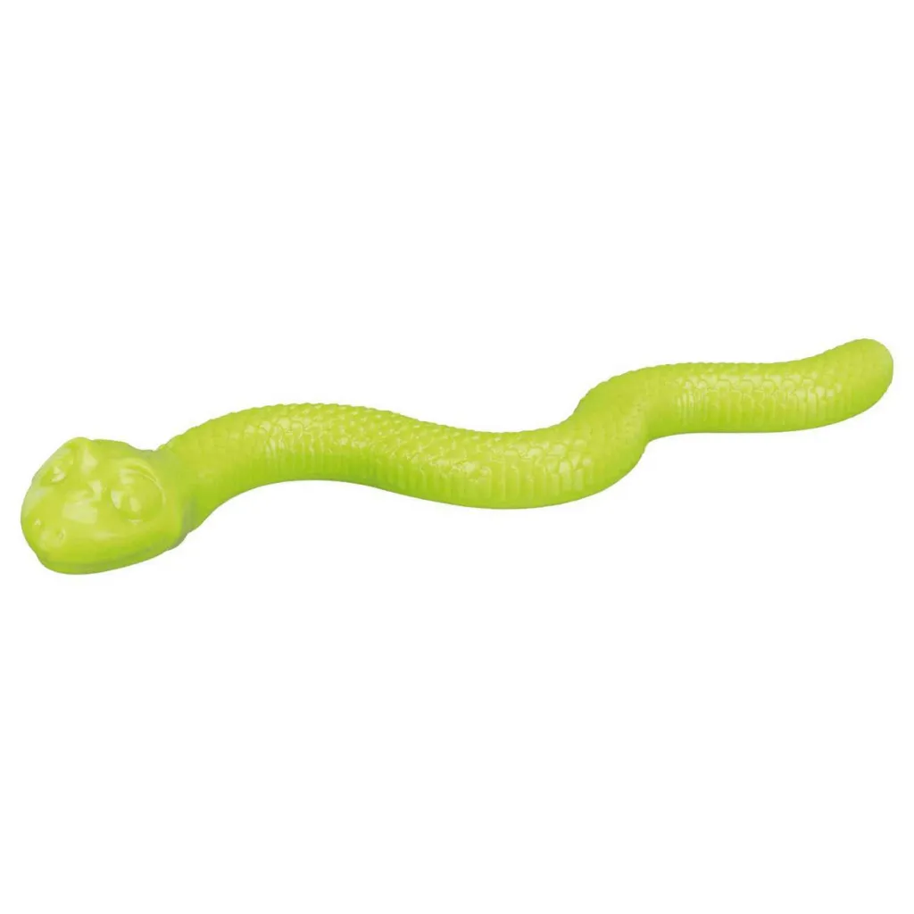 Esta serpiente con sonido al apretar su cabeza se puede abrir de par en par para que puedas rellenarla cómodamente, ya sea con snacks o con pasta para perros.