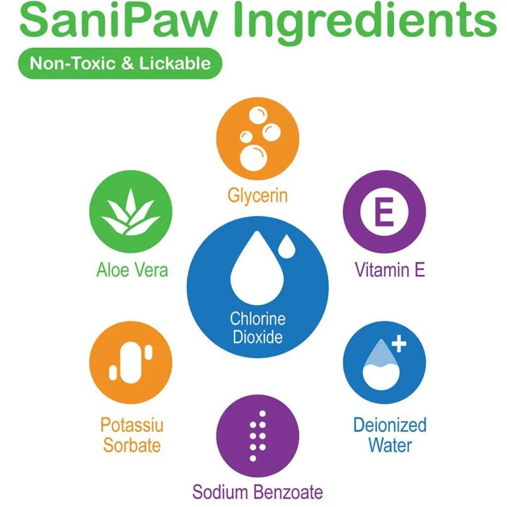 - La fórmula Sanipaw es 100% segura de usar en tu mascota y es ingerible si se lame. La fórmula utiliza dióxido de cloro, que se utiliza para desinfectar el agua potable y producir. Otras marcas utilizan cloruro de benzalconio, que es un producto químico tóxico conocido para sistemas de desarrollo y reproducción en dosis moderadas.