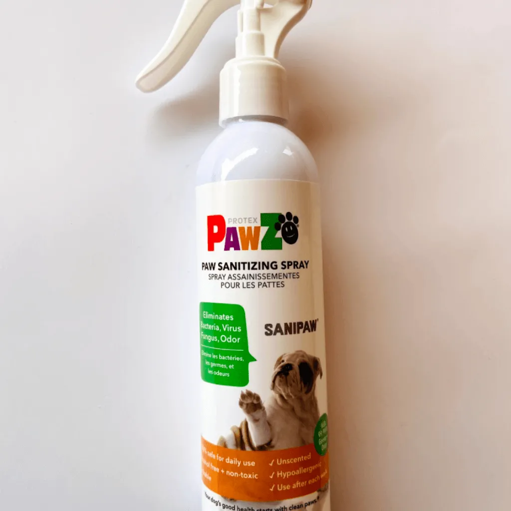 El spray para las patas de nuestros perros SaniPaw es un spray seguro y respetuoso con el medio ambiente perfecto para combatir la suciedad de sus patitas.
