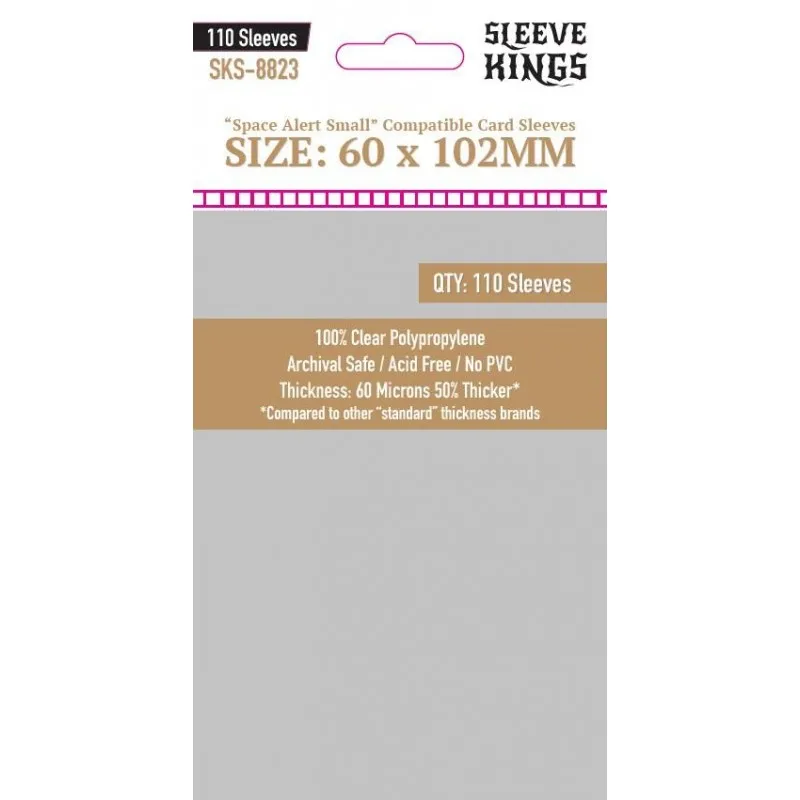 Space Alert Compatible card sleeves. Quantity 110 units. 60 x 102 mm, clear polypropylene. Manufactured by Sleeve Kings.